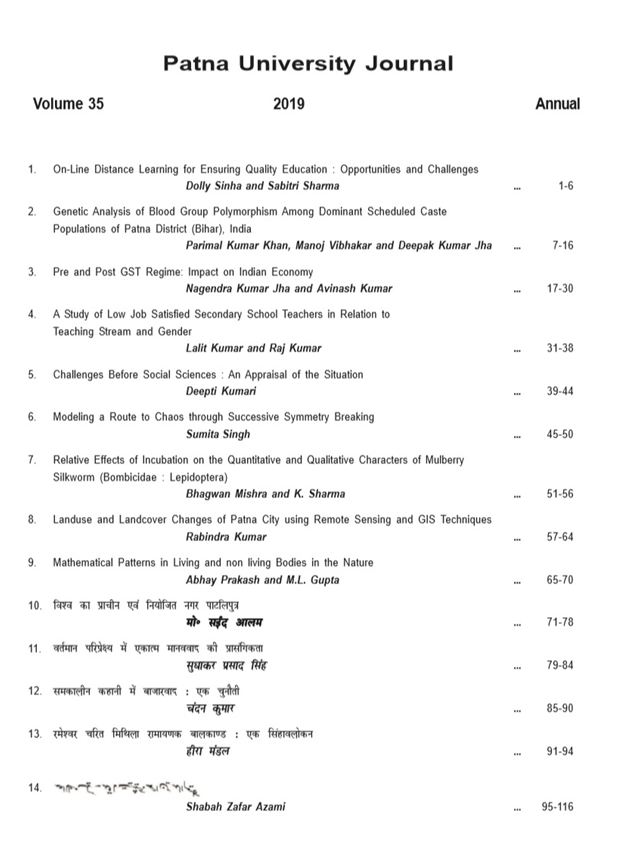Patna University Journal is a Multidisciplinary International Refereed Research Journal devoted to the publication of original, relevant and current research findings and quality review articles. The Journal is publishedonce in a year (during January-February). The submittedmanuscriptare given to the appropriate editors who choosereferees for the review of the paper. However, if a paper is judged unsuitable for the Journal by the editor, it will be rejected without external review. The journal tries to follow a strict policy for peer review by appointing reviewers (excluding members form the Editorial and Advisory Boards of the journal) who are experts in their respective fields. The manuscripts are also checked for plagiarism as per anti-plagiarism policy of Patna University based on the guidelines of UGC.